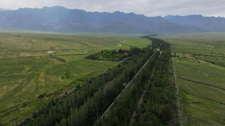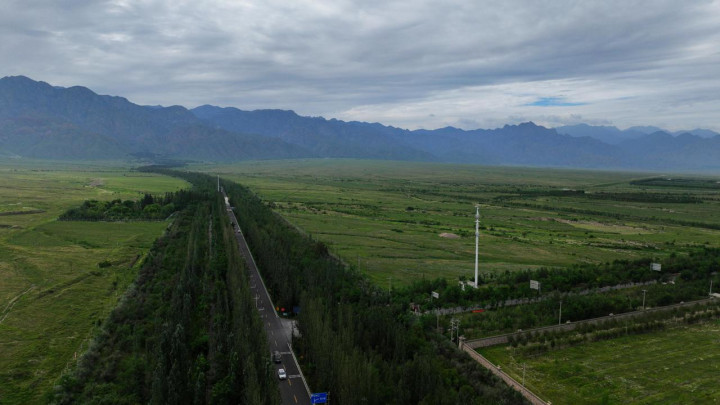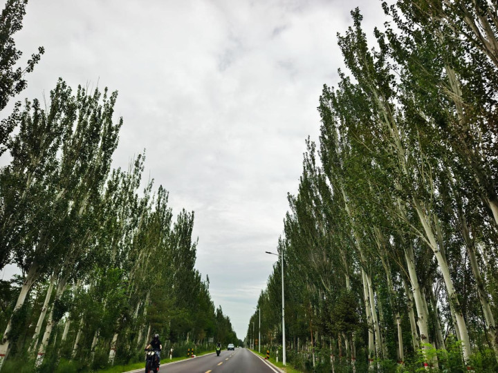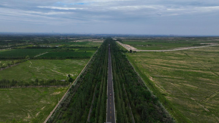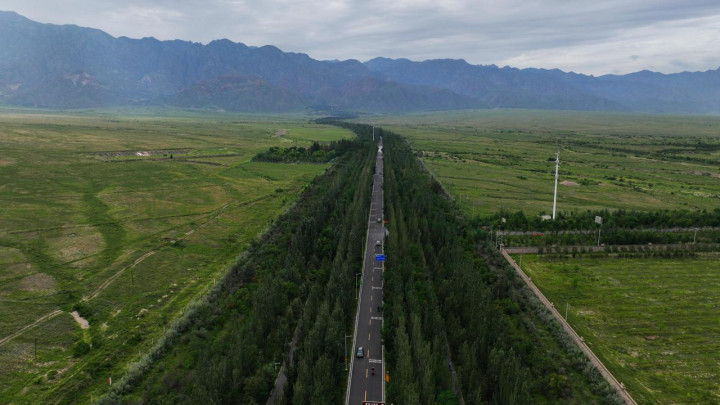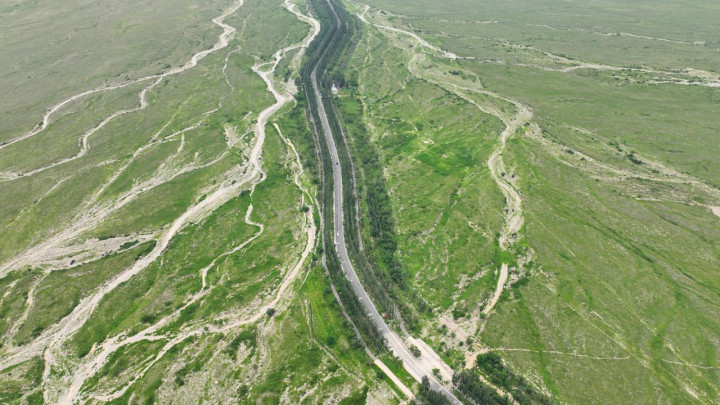 如今,这条公路路面平整,沿线还有升级版的慢行绿道,增设景观打卡点。此外,全线选用樟子松、国槐、白杨树等树木栽植两侧,树下还有红刺梅、黄刺梅、丁香、山桃等花灌木,形成两边各50米宽的防护林带,层次丰富,更凸显通透性。