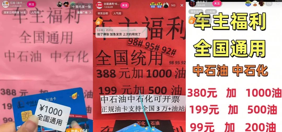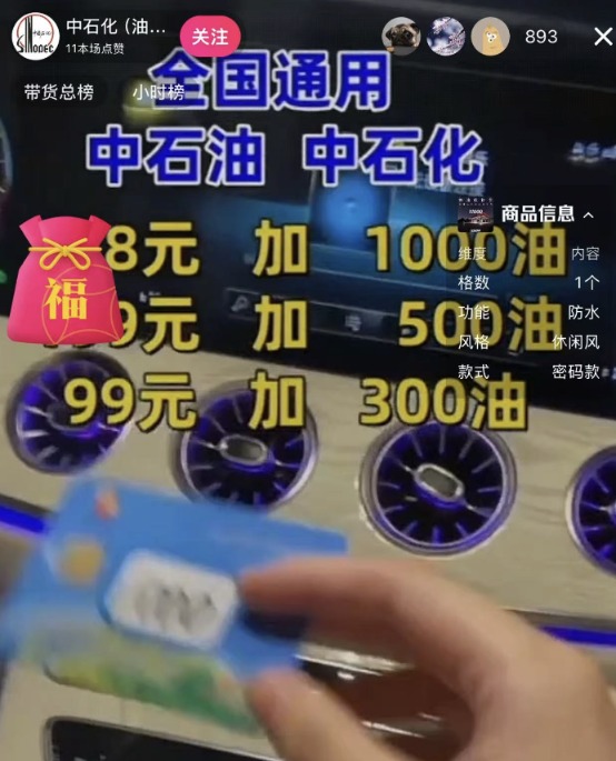 为增加可信度,一些直播间用中石化logo做头像,账号名写作“石油卡折扣”,直播间内用中石化面值1000元的正规油卡进行诱导,给消费者一种官方账号的错觉,但事实上,此类账号并无中石化官方认证。