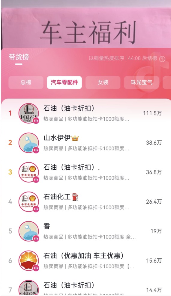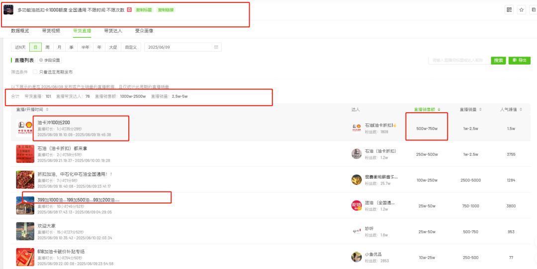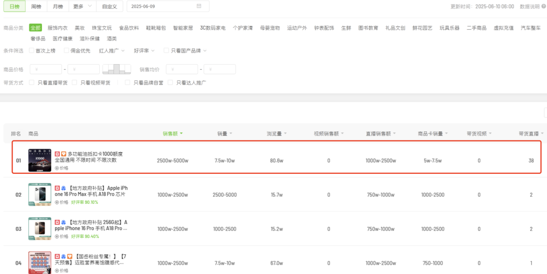 飞瓜数据显示,6月9日一条“多功能油抵扣卡1000额度”的商品链接销售额为2500万~5000万元,登顶平台全品类商品销售榜首,甚至超越了iPhone 16 Pro Max等热门数码产品。