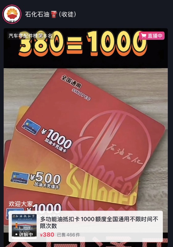 近日蓝鲸记者调查发现,网络直播平台上涌现出一批售卖“超值加油卡”的主播。他们在直播间内打着“中国石化官方合作”的旗号,叫卖各种面值的油卡,包括99元抵200、199抵500、388抵1000。