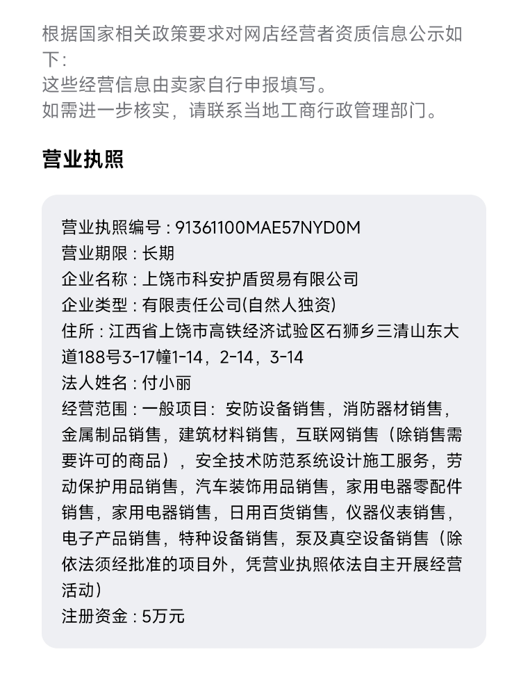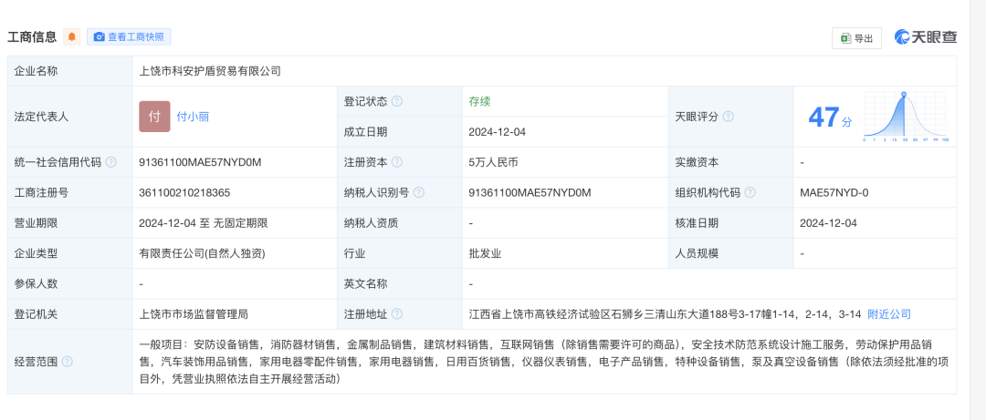 记者查询发现,6月8日至9日期间有超过70个不同账号在同步推广这一商品链接,形成矩阵式营销网络。天眼查显示,商品背后的公司为上饶市科安护盾贸易有限公司,成立时间为2024年12月,法定代表人为付小丽,注册资本5万元。