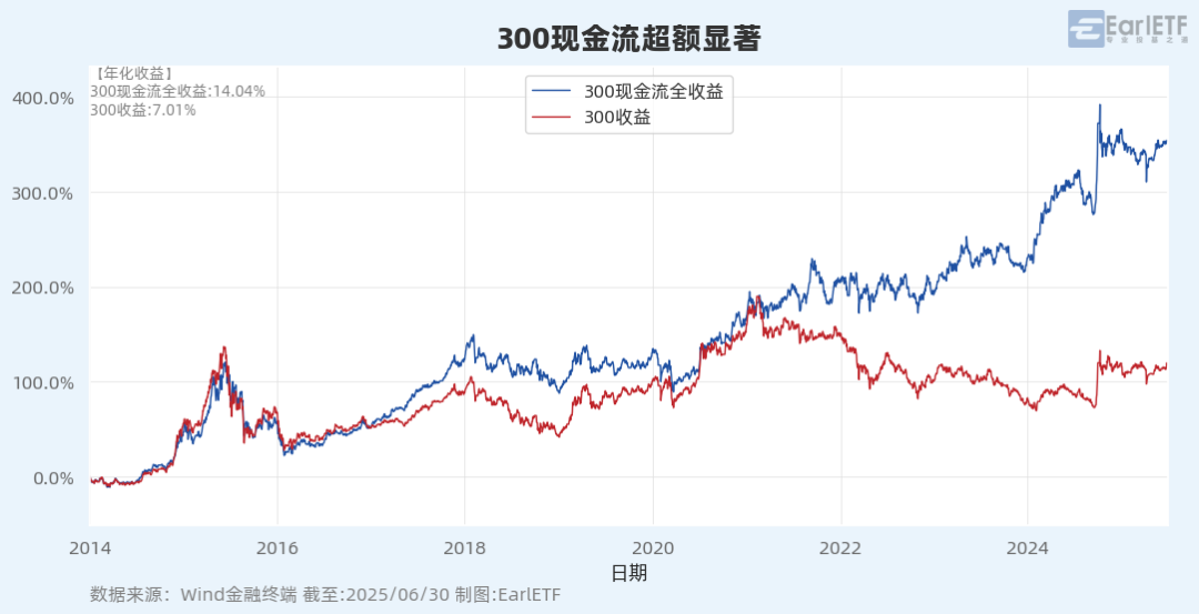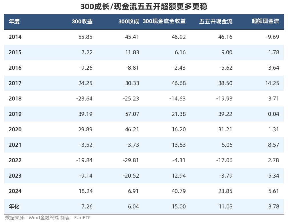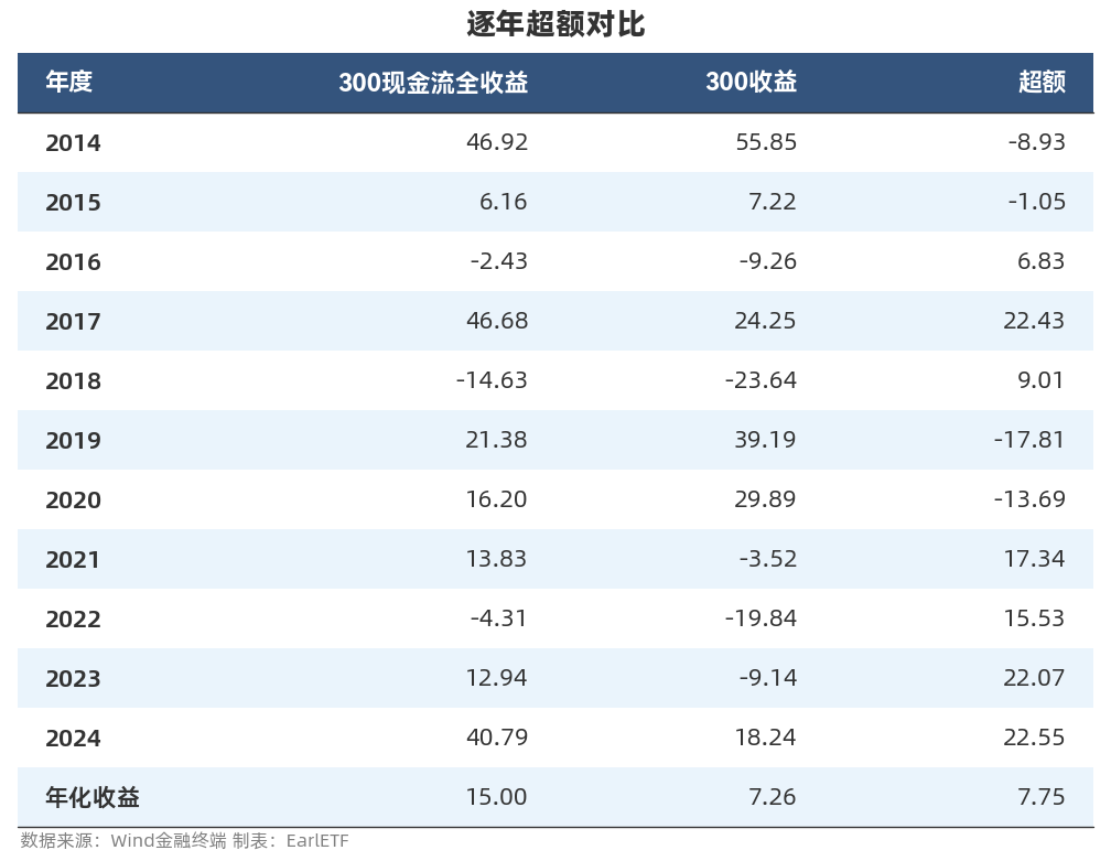 如果,我们用同属价值流的沪深300现金流全收益指数取代,你会发现除了2014年因为没有金融股加持跑输沪深300,后面每年都相较沪深300全收益指数有超额,而且2014-2024年的年化超额有3.78个百分点,相较采用沪深300价值指数,多了2个百分点。