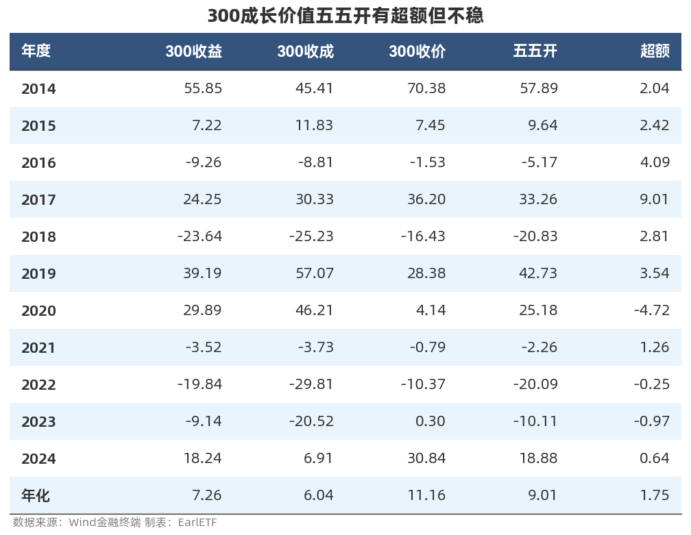 下图是一个试算,基于沪深300价值(300收价)和沪深300成长(300收成)指数,每年初50%+50%持仓构成的“五五开”组合相对沪深300全收益指数(300收益)的表现对比,可以看到可以产生1.75%的年化超额收益。但是在2020年、2022年和2023年都会跑输沪深300全收益指数。