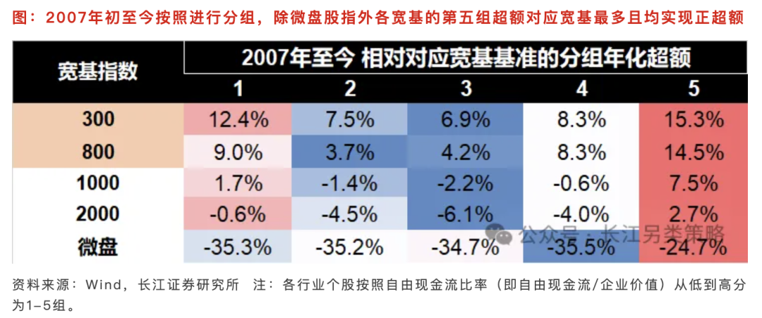 如果读者没接触过量化因子,对上面这张图可能有点摸不着头脑。以沪深300为例,12345五组,意味着根据自由现金流因子从高(第五组)到低(第一组)将所有成分股分为5组,横向来看,沪深300中自由现金流最高的那组超额收益是最强的,可见这一指标对于沪深300选股有效;纵向来看,同样第五组(自由现金流因子最强),沪深300、中证800、中证1000、中证2000都有超额,但沪深300的第五组最强,可见自由现金流因子对于沪深300最有效。