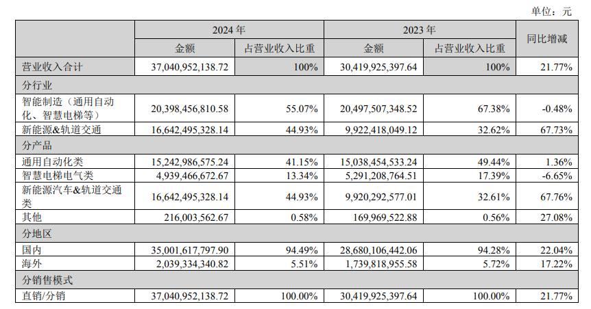 当前,汇川技术共有四大业务:通用自动化、新能源汽车、智慧电梯、轨道交通。在新能源汽车领域,联合动力为汇川技术体系内运营新能源汽车电驱系统和电源系统的唯一主体。2024年年报显示,新能源汽车、轨道交通类产品为增长最大的业务,共为汇川技术贡献了166亿元的营收,占比44.93%。