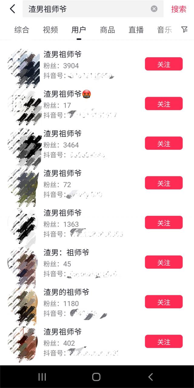 另一方面,做"擦边"内容能获得经济收益,所以不少网友效仿童锦程的人设,开设类似的账号,制作或传播更多的"擦边"内容以此获得流量。比如在抖音平台,光是"渣男祖师爷"这个名字,就有多个用户使用。