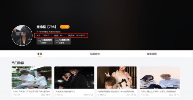 经过验证的流量配方使其迅速积累起大量粉丝,并收获了"江南第一深情""渣男祖师爷"等称号。目前,其大号"童锦程 798 "在虎牙和抖音分别有着 755.6 万和 1091 万粉丝。