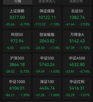 受以色列和伊朗军事冲突影响,周五A股三大股指低开低走,午后窄幅震荡,A股再次失守3400点,截止收盘,上证指数跌0.75%报3377.0点;深证成指跌1.1%报10122.11点;创业板指跌1.13%报2043.82点;沪深300跌0.72%报3864.18点;科创50跌0.51%报972.94点。